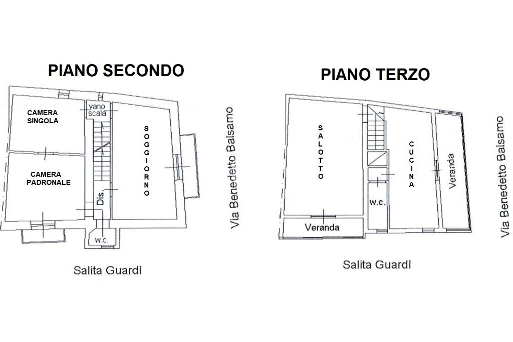Il secondo piano accoglie un soggiorno con balcone, una camera padronale con balcone ed affaccio su Salita Guardì, una camera singola e un servizio igienico. Una comoda scala interna collega al terzo piano, interamente dedicato alla zona giorno, dove troviamo una cucina abitabile con balcone verandato, un ampio salotto con altro balcone verandato e un servizio igienico con vasca.